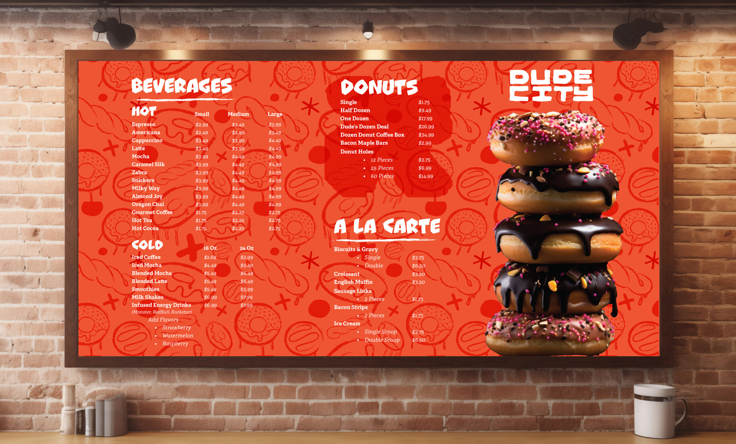 Dude City Donuts is a 24 hour donut shop in Salem, OR. I have always liked the name and thought it could be a cool brand. I did research on some other donut shops around town and wanted to make a unique, edgy, and fun brand to go along with the cool name. Here is my take on the Dude City Donuts brand.